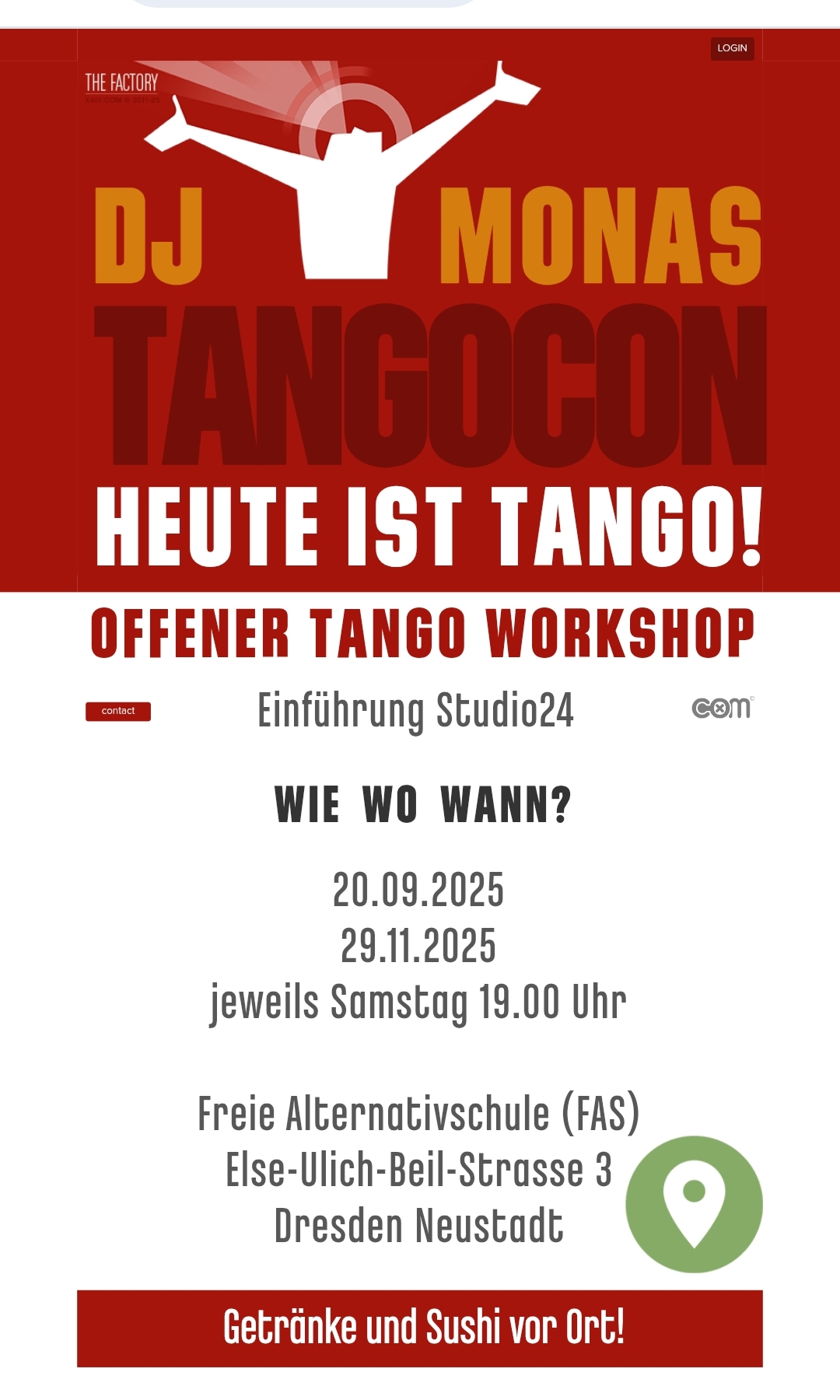 20-21 Uhr Tangopraktika, 21-23:00 Uhr Übungsmilonga, bei der wir euch bei Bedarf unterstützend zur Seite stehen, Anmeldung nicht erforderlich, einfach paarweise vorbeikommen, 10 EUR (nur Übungsmilonga 4 EUR)